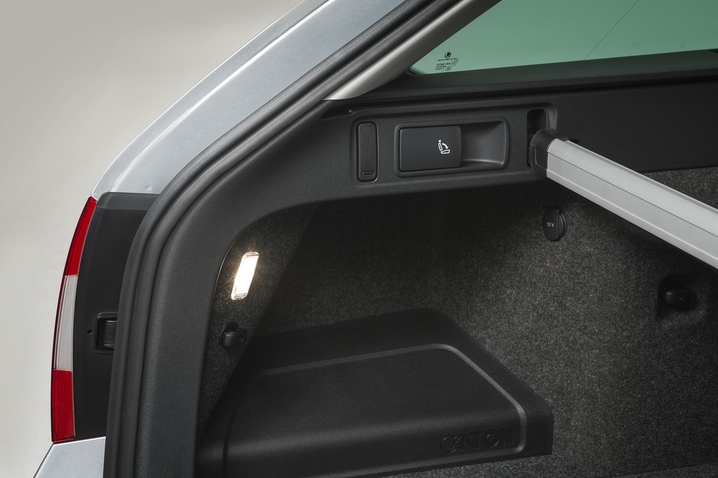 Le couvre-coffre déroulant est amovible et peut être rangé sous le plancher intermédiaire. Le dossier de la banquette arrière peut être rabattu complètement ou dans un rapport 60/40. Un filet de séparation disponible en option empêche que des objets rangés dans le coffre ne soient projetés vers l’avant en cas de freinage brusque. Ce filet peut également être utilisé lorsque les dossiers de la banquette arrière sont rabattus.